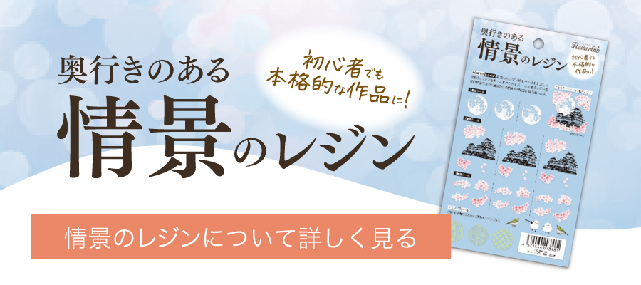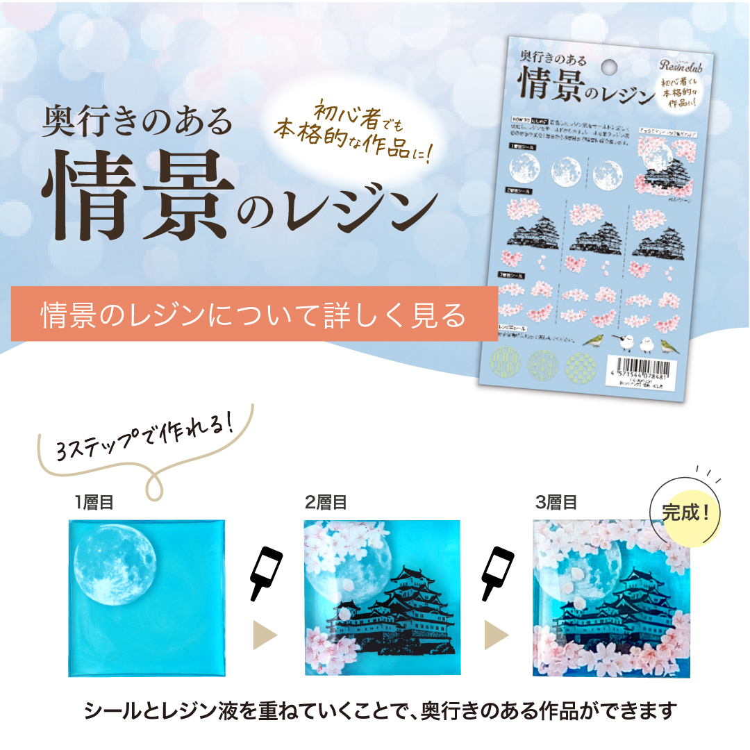 初心者でも順番に沿ってシールとレジンを重ねていくことで、奥行きのある本格的な作品を作ることができるレジン用シールです。情景のレジン第一弾は、満月を背景にした城を桜の花で彩る情景ができる和のデザインです。